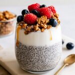 - Assemble and serve: When ready to serve, scoop the chia pudding into two glasses or bowls. Add layers of granola if desired. Top each serving with ¼ cup of Greek yogurt, fresh berries, additional granola, and nut butter or other favorite toppings.