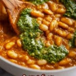 A hearty and flavorful simple bean soup featuring cannellini beans simmered with aromatic herbs, garlic, and tomato passata, thickened with a blended portion of soup and enhanced by a vibrant hazelnut and parsley picada. Perfect as a comforting vegetarian main course with crusty bread.